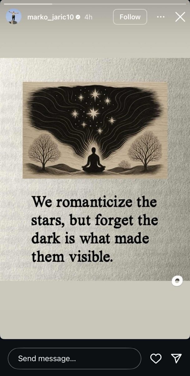 "Romantizujemo zvezde, ali zaboravljamo da ih je tama učinila vidljivima" stoji na storiju Marka Jarića.