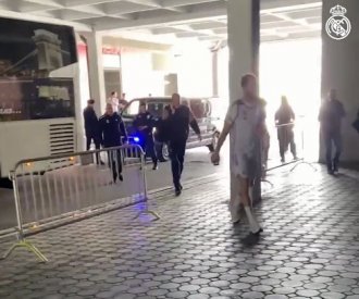 Partizan i Real Madrid treći meč plej-ofa Evrolige igraju u utorak od 20.30 (SK1). Madriđani su nekoliko sati pre utakmice odradili trening, a policija ih je u stopu pratila, što se vidi na snimku, kao i prilikom dolaska u Beograd.
