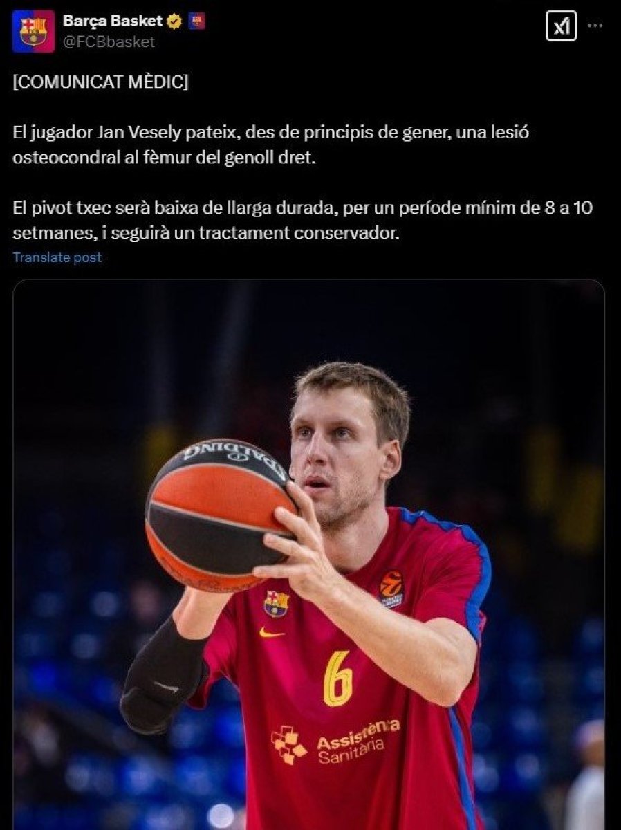 Kako je saopštio katalonski klub, češki centar tako će morati da pauzira od osam do deset nedelja. To znači da Veseli neće moći da pomogne Barseloni u važnim mečevima u borbi za plej-of u Evroligi, kao i utakmicama ACB lige. Veseli će tako izvesno propustiti meč protiv svog bivšeg kluba Partizana, koji je na programu 14. marta u okviru 29. kola Evrolige. Španski klub je trenutno osmi na tabeli u Evroligi sa skorom 14-11.