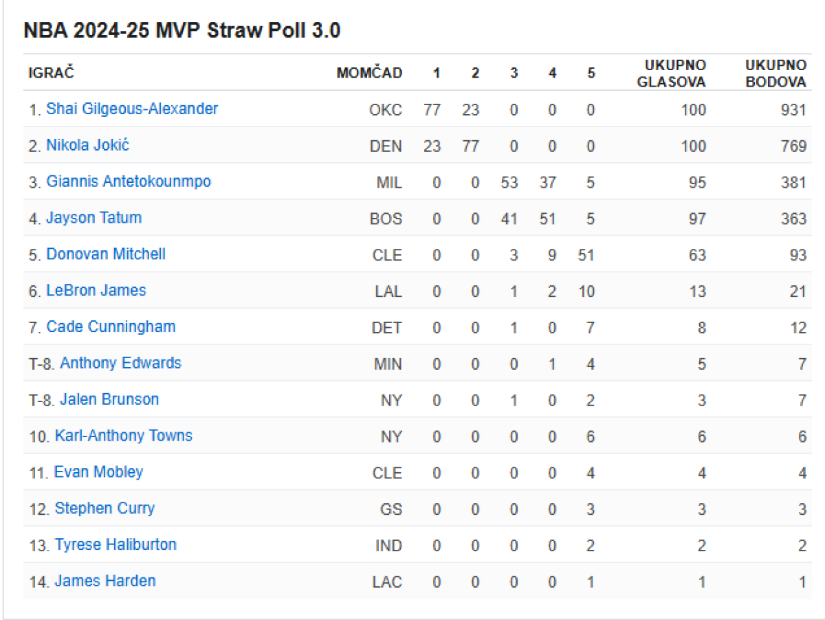 Glasovi ove neformalne ankete su bili tačni svih prethodnih sezona, pa je malo verovatno da neće tako biti i sada. Anketa predstavlja glasanje lige, a Šej je dobio 77 od 100 glasova za prvo mesto, a Jokić preostala 23. Košarkaš Oklahome je prilikom glasanja dobio 931 poen, a Jokić 769.Treći je Janis Adetokumbo sa 381 glasom, Džejson Tejtum ima 363, a Donovan Mičel 93.