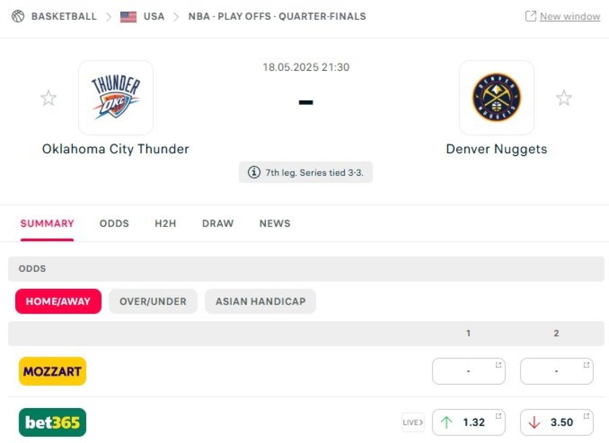 Kvota da će Oklahoma slaviti i plasirati se u finale Zapada, gde je već ekipa Minesote, u ovom trenutku iznosi svega 1,32. Sa druge strane, koeficijent da će slaviti Nagetsi iznosi 3,50. Biće da kladionice mnogo više veruju u Oklahomu i njen domaći teren, iako je Denver kroz ovu seriju dokazao da može da se nosi sa pobednikom Zapada u ligaškom delu NBA.