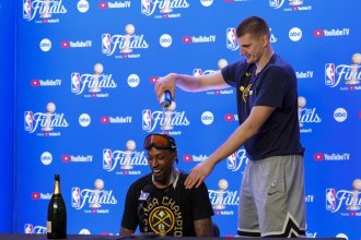 Pre Jokića je za konferencijskim stolom sedeo saigrač Kentavijus Koldvel Poup, pričao, a onda mu se iza leđa pojavio Džoker, sručio mu limenku piva na glavu i zauzeo njegovo mesto.