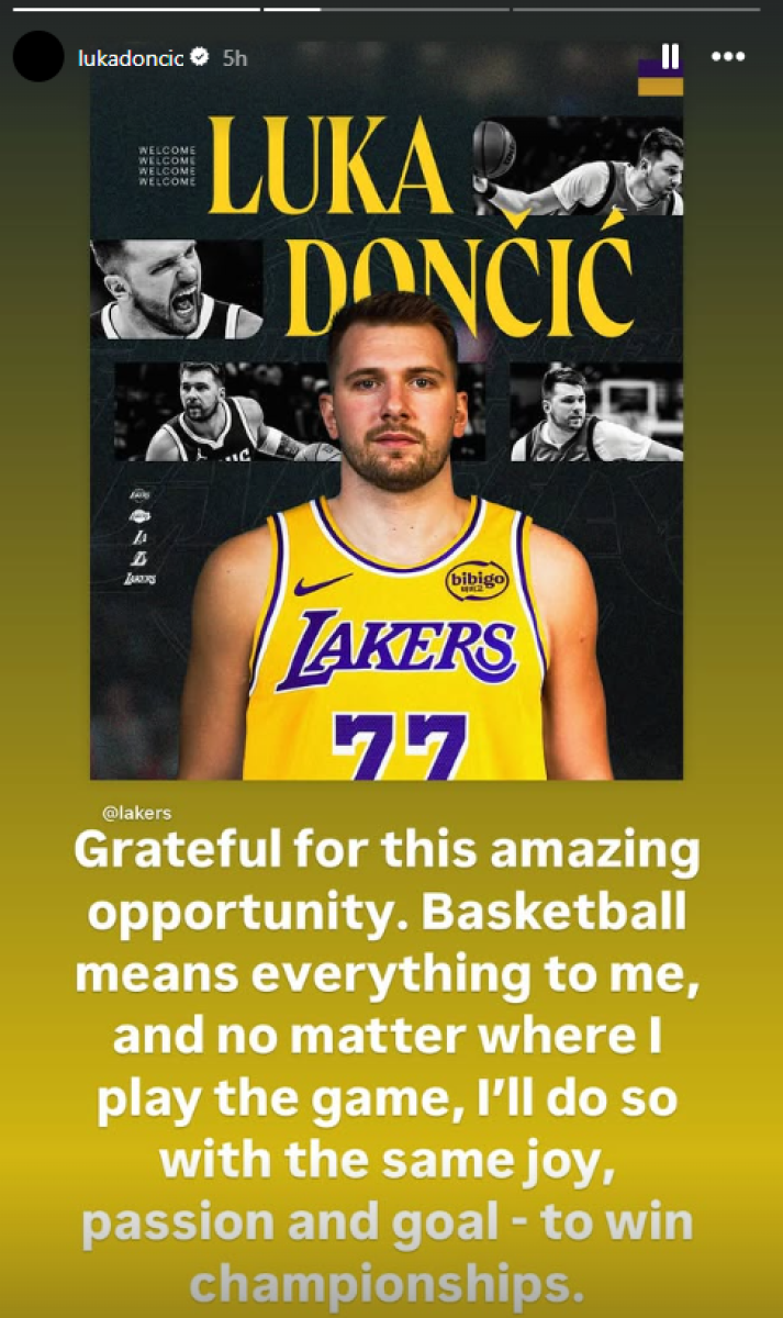"Zahvalan sam na ovoj neverovatnoj prilici. Košarka mi znači sve i nije bitno gde igram ovu igru, radiću to sa istim zadovoljstvom, strašću i ciljem - da osvojim titulu", stoji u poruci Dončića upućenoj svima, najviše navijačima Lejkersa.