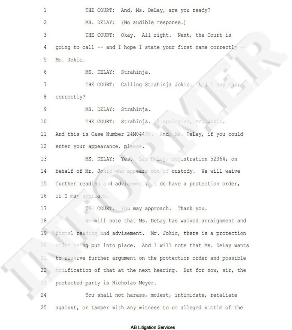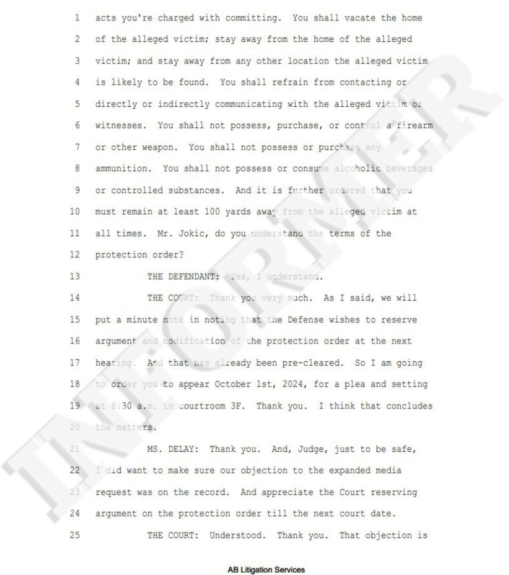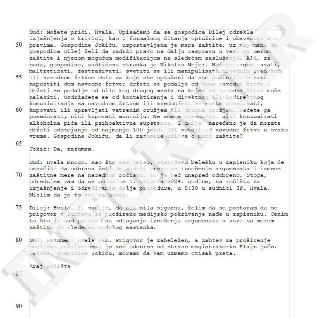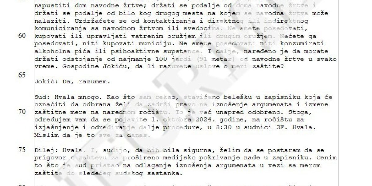Isto tako, advokatica Jokića, Liz Dilej, pokušala je da zakaže diskusiju kako bi se osporila spomenuta mera zaštite, ali joj je sudija Mišel Martinez samo rekla da je ona već odobrena od strane magistratorke, pa može da se zaključi da su male šanse da mera zaštite bude povučena.