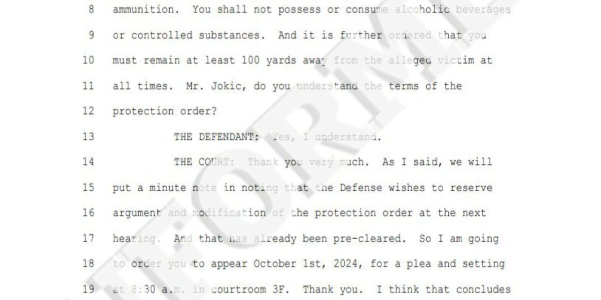 Strahinja Jokić, najstariji brat Nikole Jokića, dobio je zabranu prilaska čoveku, zbog koga je optužen za napad na jednoj utakmici Denvera prošle godine, ekskluzivno otkriva Informer! Osim toga, zabranjeno mu je da poseduje i kupuje oružje, kao i alkohol i psihoaktivne supstance, a Informer je došao u posed sudskog transkripta sa tri dosadašnja ročišta. U tim transkriptima možete da pročitate šta je tačno bilo izrečeno tokom saslušanja. Važno je napomenuti da to nije konačna presuda, već samo mera zabrane tokom saslušanja, a suđenje je zakazano za 18. april.