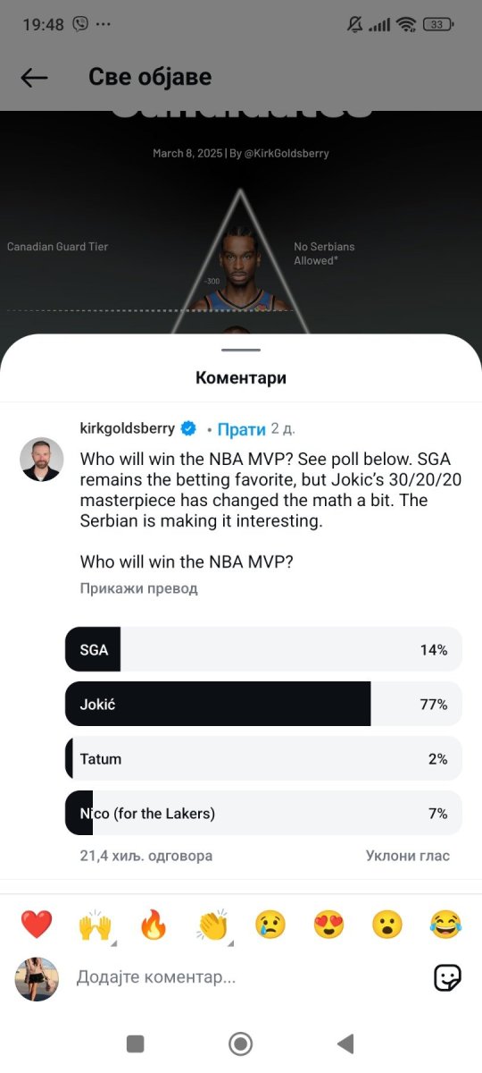 Kirk Goldsberi vodeći je košakaški analitičar u NBA, pitao je fanove na Instagramu ko će biti MVP i Nikola Jokić ubedljivo vodi, ako pitate navijače. Na pitanje ko će pobediti u MVP trvi Jokić je dobio 77 odsto glasova, Šej 14, a Tejtum dva odsto.