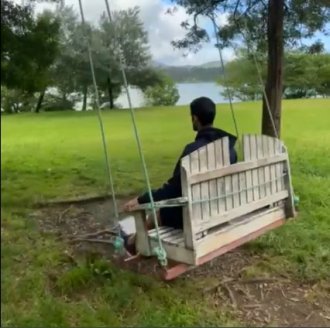 Na snimku se vidi kako Novak Đoković, koji brani trofej na Vimbldonu, sedi na ljuljašci i uživa uoči početka turnira.