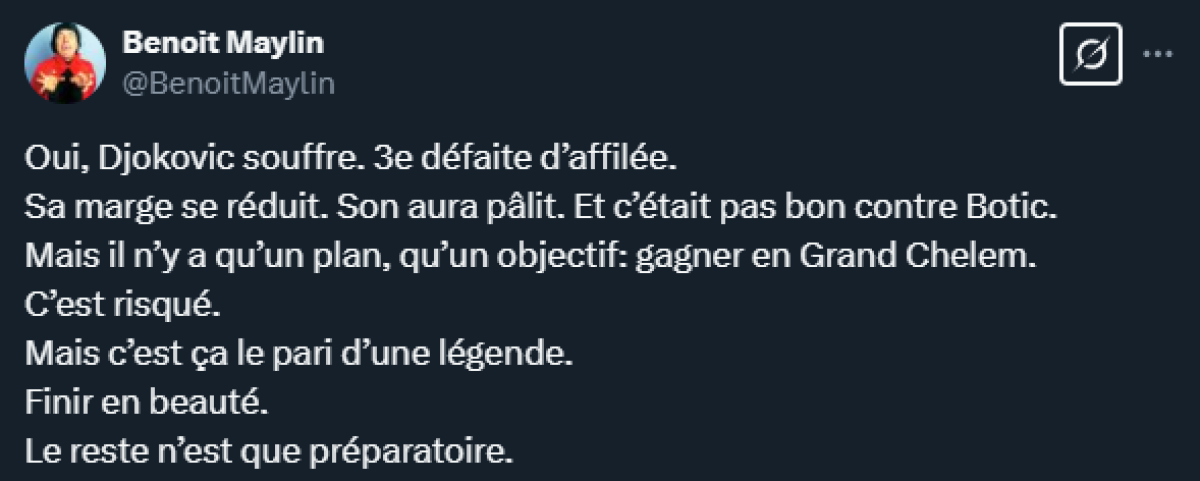 -Da, Đoković pati. Treći poraz zaredom. Njegova margina se smanjuje, njegova aura bledi. Nije bilo dobro protiv Botika. Ali postoji jedan plan. To je osvajanje gren slema. Veoma je rizičan, ali to je opklada legende. Završiti na najvišem nivou. Sve ostalo je samo priprema - rekao je novinar Benoa Mejlan.