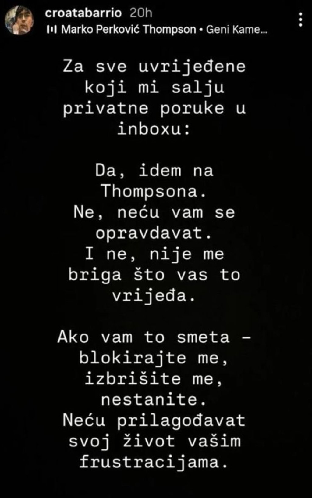 "Za sve uvređene koji mi šalju privatne poruke u inboksu. Da, idem na Tompsona. Ne, neću vam se pravdati. I ne, nije me briga što vas to vređa. Ako vam to smeta, blokirajte me, izbrišite me, nestanite. Neću prilagođavati svoj život vašim frustracijama", napisao je Kroata Bario.
