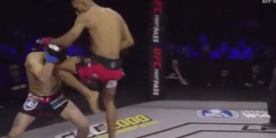 Zalaz je u letu desnim kolenom udario Amerikanca u glavu, a ovaj je pao kao sveća i to je bio kraj šou programa.