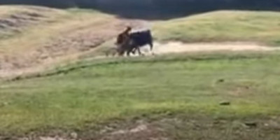 Biciklista je nepomično ležao na travi nakon što je dobio dva snažna udarca, a imao je sreće, jer je bik odustao psole dva napada.