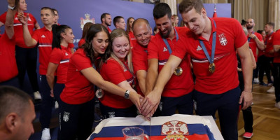 Po završetku svih formalnosti, srpski reprezentativci koji su osvojili medalje na protekloj sportskoj smotri isekli su zajedno pobedničku tortu. Pogledajte i kako je to izgledalo.
