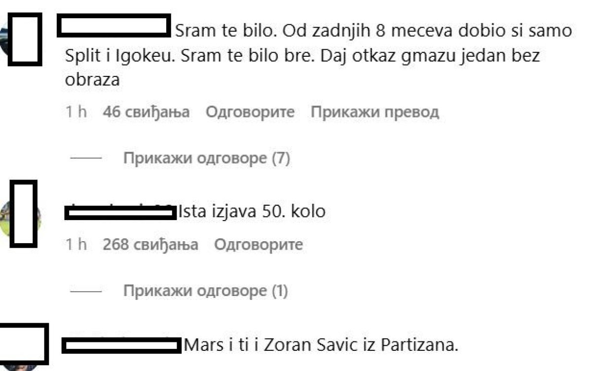 "Sram te bilo. Od zadnjih osam mečeva dobio si samo Split i Igokeu. Sram te bilo bre. Daj otkaz gma*u jedan bez obraza", "Marš i ti i Zoran Savić iz Partizana", komentari su navijača Partizana na društvenoj mreži Instagram.