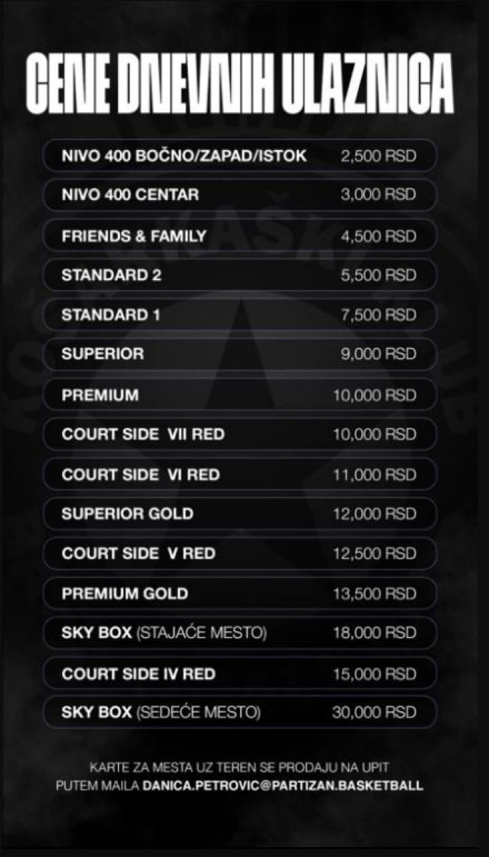 Blagajna Beogradske arene: četvrtak od 12 do 20 časova, subota od 12 do 18 časova, i ponedeljak od 12 časova do početka utakmice.