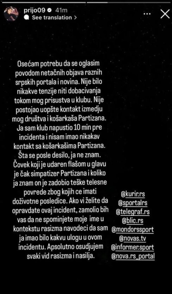 - Osećam potrebu da se oglasim povodom netačnih objava raznih srpskih portala i novina. Nije bilo nikakve tenzije, niti dobacivanja tokom mog prisustva u klubu. Nije postojao uopšte kontakt mog društva i košarkaša Partizana. Ja sam klub napustio deset minuta pre incidenta, i nisam imao nikakav kontakt sa košarkašima Partizana. Šta se posle desilo, ja ne znam. Čovek koji je udaren flašom u glavu je čak simpatizer Partizana i koliko znam, on je zadobio teške telesne povrede, zbog kojih će imati doživotne posledice. Ako vi želite da opravdate ovaj incident, zamolio bih vas da ne spominjete moje ime u kontekstu rasizma, navodeći da sam ja imao bilo kakvu ulogu u ovom incidentu. Apsolutno osuđujem svaki vid rasizma i nasilja - napisao je Prijović.