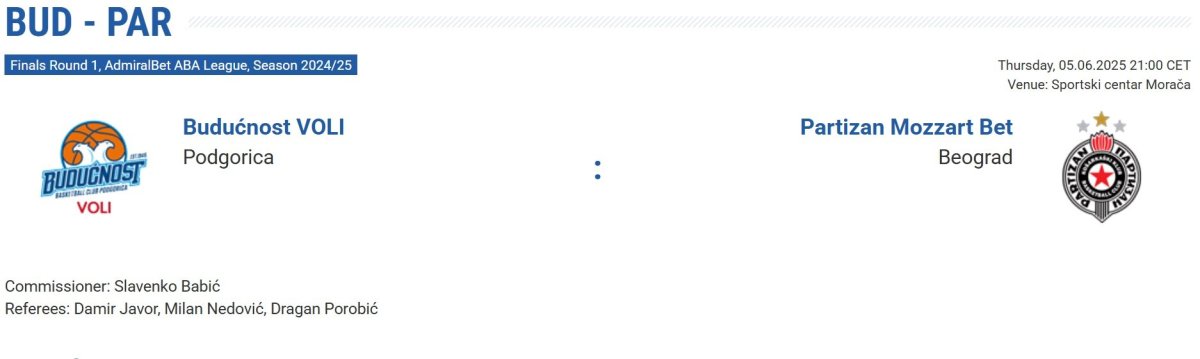 Što se tiče ostalih arbitara, Milan Nedović je nedavno bio deo sudijske trojke tokom finala Evrolige, a poznat je po tome što vrlo često pribegava deljenju tehničkih grešaka. Na njegovo suđenje tokom januara žalila se Baskonija, a ABA liga će najverovatnije prekosutra odrediti i arbitre za drugi meč, koji je na programu u subotu takođe u Podgorici.