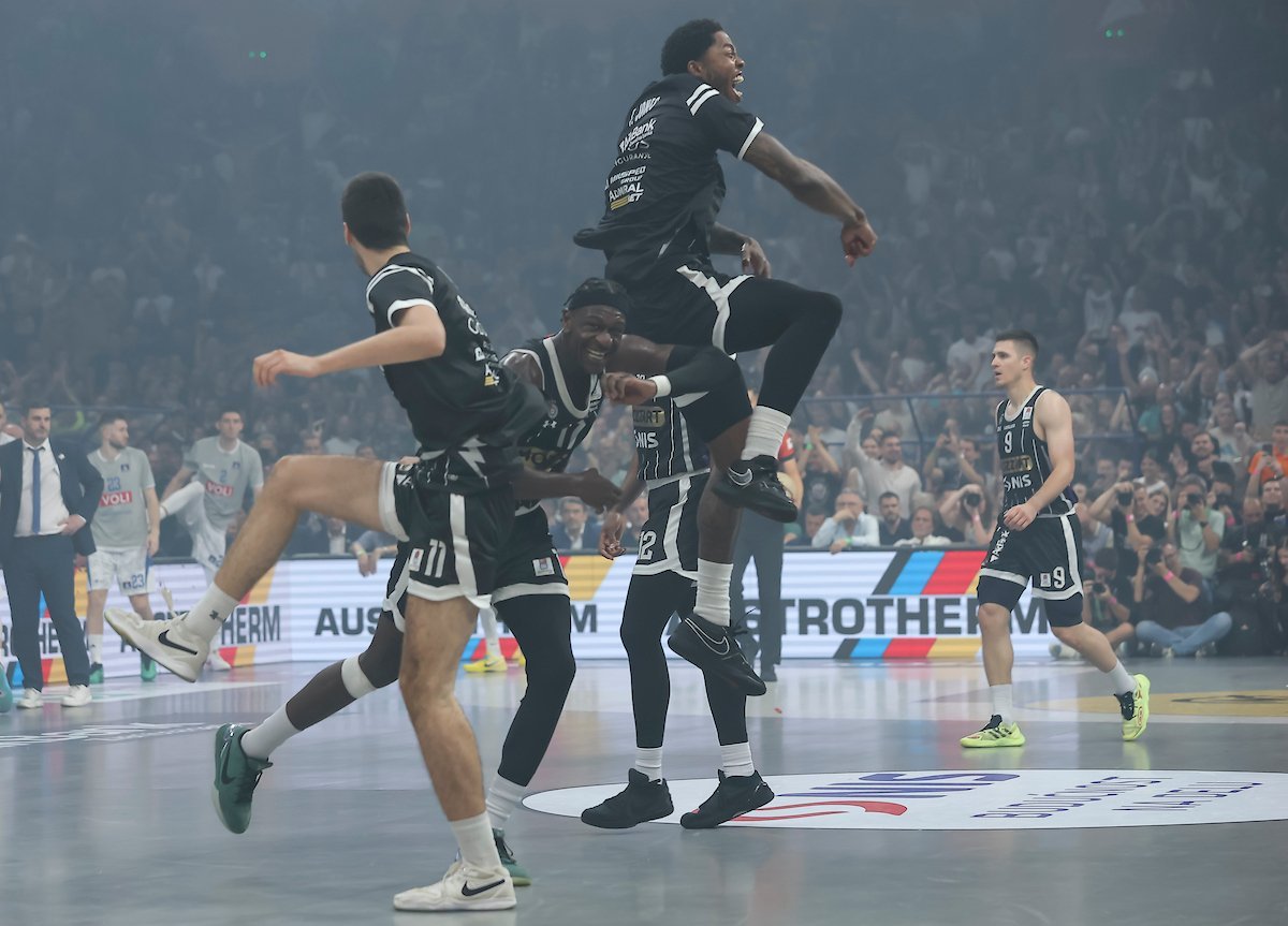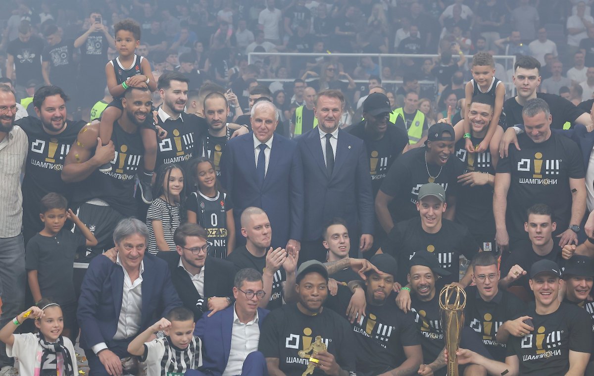 Košarkaši Partizana predvođeni kapitenom Vanjom Marinkovićem podigli su šampionski pehar namenjen pobedniku ABA lige.