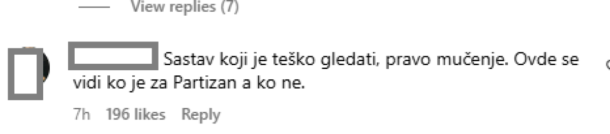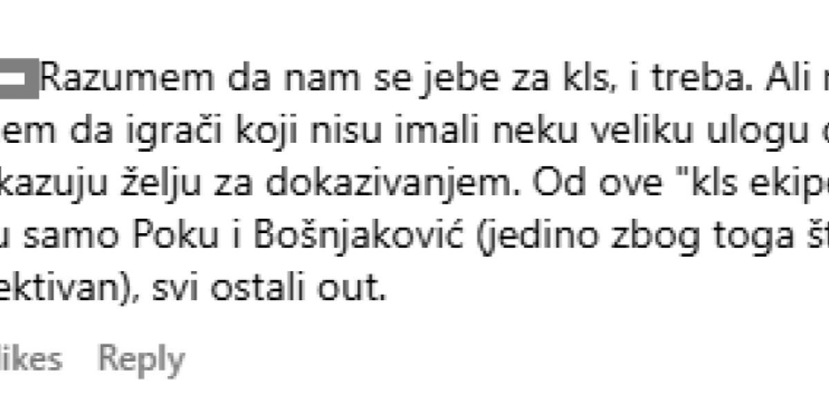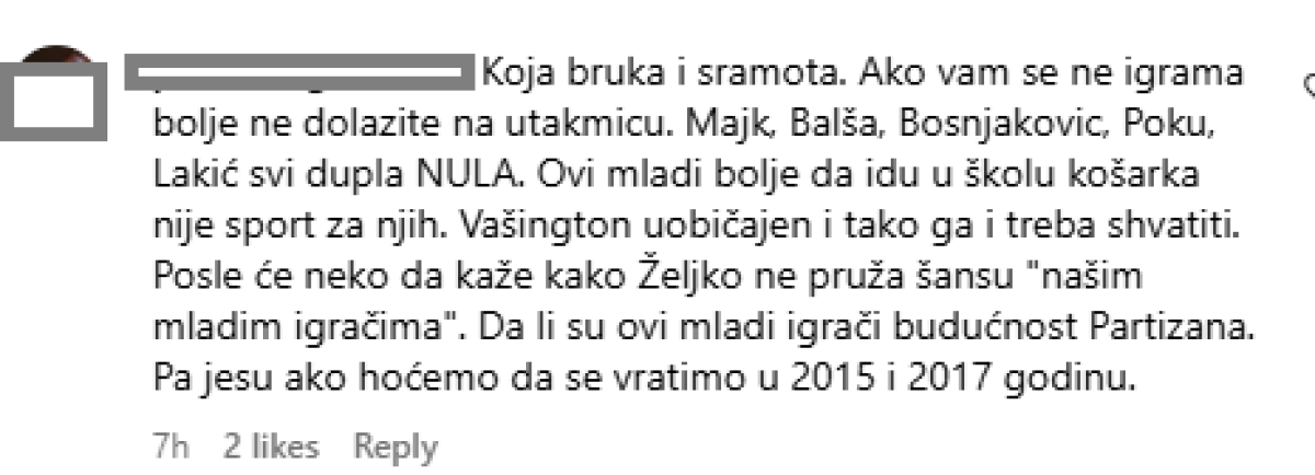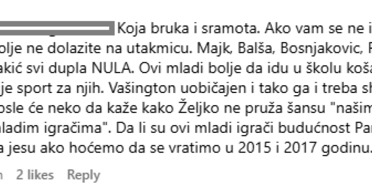"Sastav koji je teško gledati, pravo mučenje. Ovde se vidi ko je za Partizan a ko ne", "Najblaže rečeno, bilo vas je neprijatno gledati", "Ubila me je ova utakmica, uzas jedan", "Sramota! Ovo je moralo da se resi u dve utamice! I koji kurac sede Bonga i Vanja ako nece igrati? Treba uzeti trofej, trofeji se samo racunaju!", "Tuga", "Da li će neko izbaciti Majka iz ekipe strašno kako je loš igrač vraćajte Lovrenja bar ce da se bori za naš grb", "Razumem da nam se je*e za KLS, i treba. Ali ne razumem da igrači koji nisu imali neku veliku ulogu ove sezone ne pokazuju želju za dokazivanjem. Od ove "kls ekipe" treba da ostanu samo Poku i Bošnjaković (jedino zbog toga što je mlad i perspektivan), svi ostali aut", "Koja bruka i sramota. Ako vam se ne igrama bolje ne dolazite na utakmicu. Majk, Balša, Bosnjakovic, Poku, Lakić svi dupla NULA. Ovi mladi bolje da idu u školu košarka nije sport za njih. Vašington uobičajen i tako ga i treba shvatiti. Posle će neko da kaže kako Željko ne pruža šansu "našim mladim igračima". Da li su ovi mladi igrači budućnost Partizana. Pa jesu ako hoćemo da se vratimo u 2015. i 2017. godinu", samo su neki komentari nezadovoljnih "grobara" na društvenim mrežama.