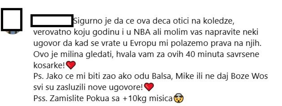 "Ovo bi bila jedna od najlepših priča, sa juniorima osvojili", "Sigurno je da će ova deca otići na koledže, verovatno koju godinu i u NBA, ali molim vas napravite neki ugovor da kad se vrate u Evropu mi polazemo prava na njih. Ovo je milina gledati, hvala vam za ovih 40 minuta savršene kosarke! Jako će mi biti žao ako odu Balša, Mike ili ne daj Bože Vos, svi su zaslužili nove ugovore".
