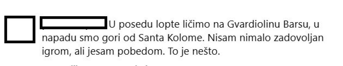 "Vidi li neko još ili sam ja potpuno poludeo koliko je mali Jovanović špic, doktor nauka za Miloševića?", "Živim za dan kad ćemo imati beka koji ume da uputi kršten centaršut", "Štoperski tandem Đurđević i Simić - zločin koji traje", "Jaako bledo, da se naoružamo živcima do kraja sezone", "Svaki put kad Jurčević uputi centaršut jedno dete odustane od fudbala", "Peđa iscimaj neke sponzore i dovedi nekog molim te…", "Makni više Natha čovek ima 40 godina ne može da ide a ne da trči, svaka čast na svemu ali čovek posle 20 minita ne može da mrdne", "Šta je sa pojačanjima bree? Obećani Jovetić, Nastasić, Savić? Sa kojim igračim da de igra Evropa bre?", "Bravo Peđa za malog Kostica, ako još prodate Kalulua častim čokoladno mleko", "U posedu lopte ličimo na Gvardiolinu Barsu, u napadu smo gori od Santa Kolome. Nisam nimalo zadovoljan igrom, ali jesam pobedom. To je nešto", komentari su navijača Partizana na društvenoj mreži "Instagram".