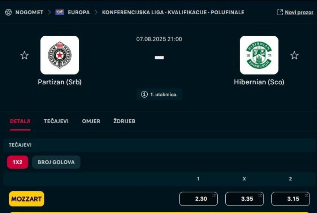 Fudbaleri Partizana veliki su favoriti za trijumf nad škotskim Hibernijanom (7. avgust, 21.00) u trećem kolu kvalifikacija za Ligu konferencija, preliminarne su procene bukmejkera.