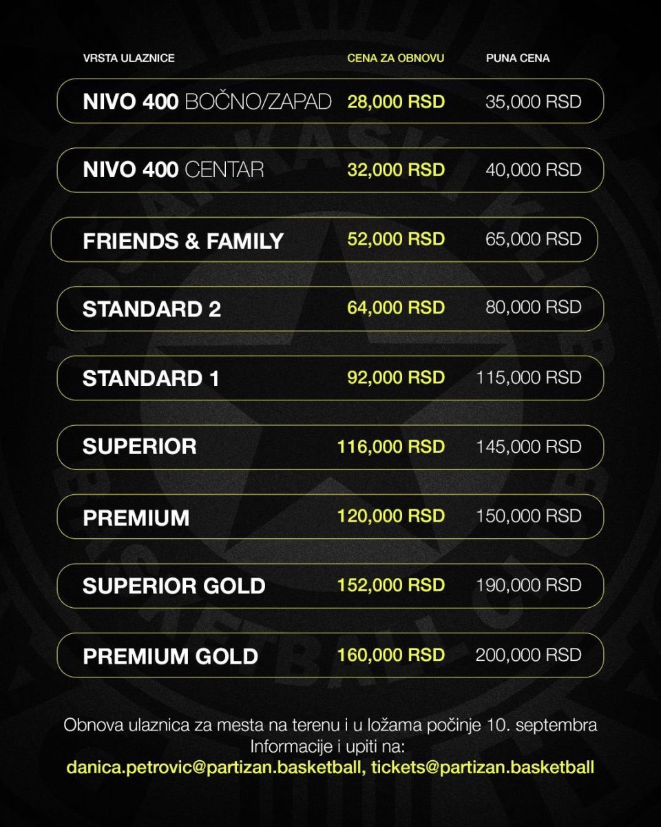 "Tokom prethodnih sezona, crno-beli su imali ogromnu podršku iz svih sektora Beogradske arene, a ogromnu većinu u hali, činili su vlasnici sezonskih ulaznica. Iz zahvalnosti prema starim sezoncima, KK Partizan je i ove godine odlučio da prodaju podeli u tri faze, dajući prednost onima koji su uz crno-bele bili i u sezoni 2024/25", navodi se na zvaničnom sajtu kluba.