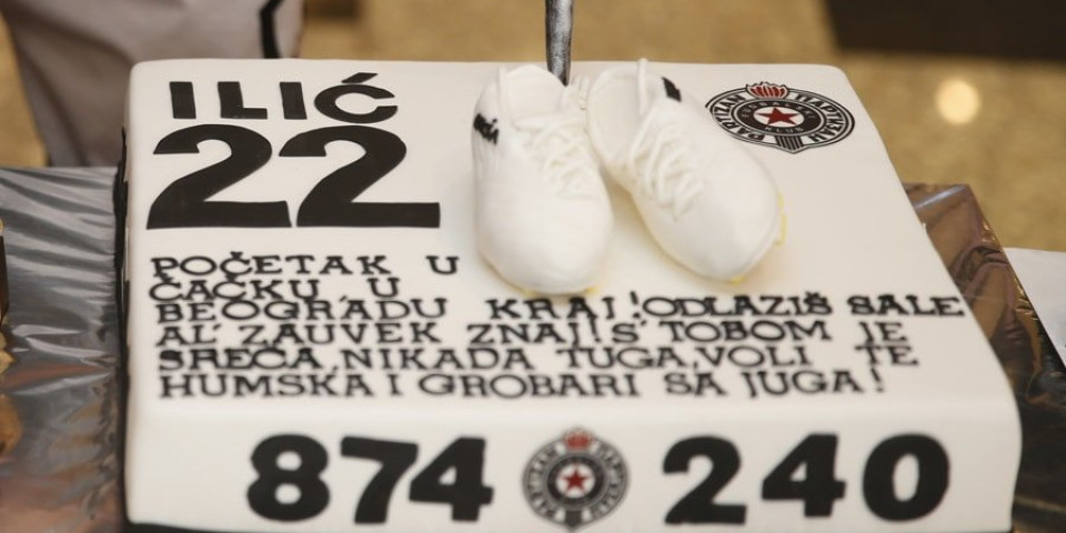 Kapiten crno-belih je dobio i tortu sa posvetom, a na njoj je bio ispisan i broj utakmica i golova što je Ilić ostvario u Partizanu.