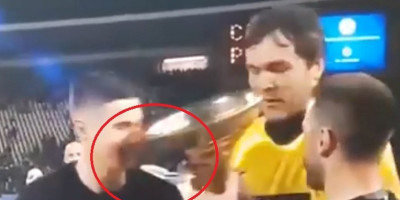 Slavili su crno-beli, a onda su stali da daju izjave. Dok su Pantić i Tošić pričali priključio im se Vladimir Stojković sa sve peharom. Od silne radnosti udario je mladog vezistu u glavu.