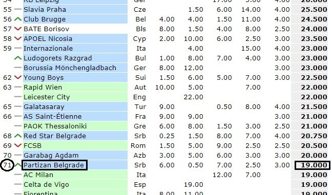 Crvena zvezda je trenutno ispred Partizana sa koeficijentom 20.750, a Partizan je na 71. poziciji sa 19.000.