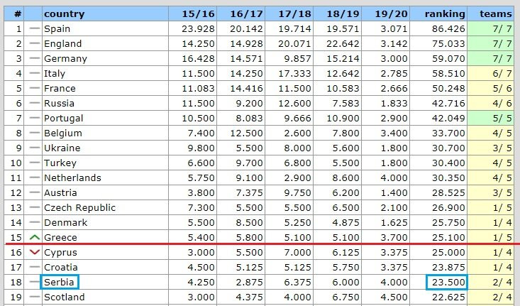 - Srbija ima dva tima u Evropi (Crvena zvezda u LŠ a Partizan u LE) i to je veliki adut naše zemlje u borbi sa konkurentskim zemljama! Svaki remi jednog od ova dva kluba vredeće novih 0,250 a svaka pobeda novih 0,500 bodova za nacionalni koeficijent Srbije.