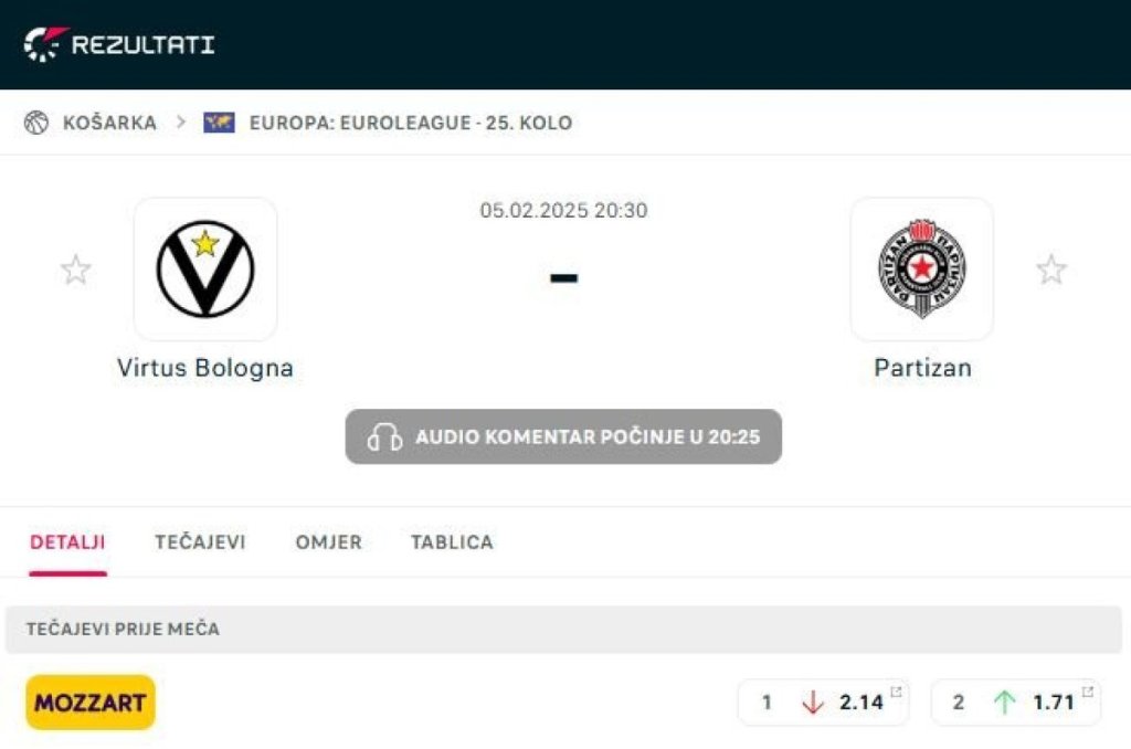 Crno-beli će sutra imati odličnu priliku za popravni ispit, a prema mišljenju bukmejkera, smatraju se velikim favoritima za pobedu u "Segafredo areni". Koeficijent za trijumf Partizana postavljen je na 1,71, dok je pobeda domaće ekipe ocenjena kvotom 2,14.