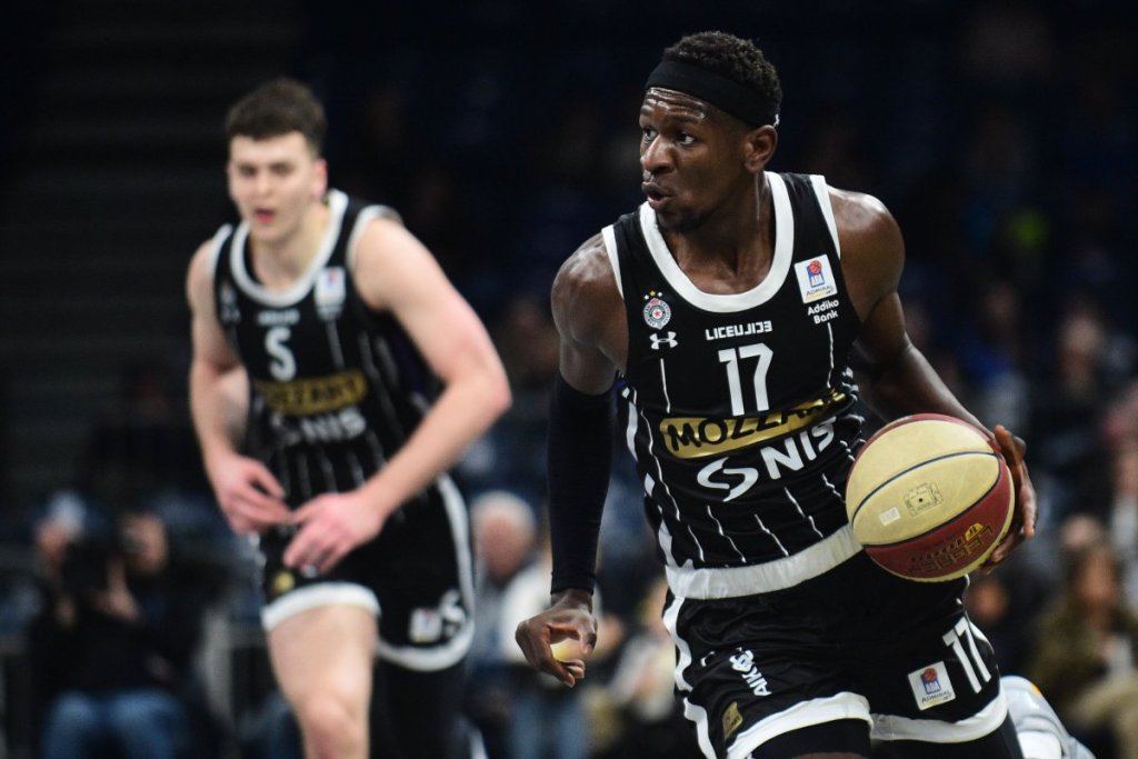 Sterling Braun je najefikasniji igrač prvog poluvremena sa 15 poena (7/8 iz igre), dok Vanja Marinković i Karlik Džons imaju po osam poena. Džons je upisao i tri skoka, tri asistencije i jednu ukradenu loptu. Partizan šutira odlično za dva poena (14/21), ali slabije spolja (3/11 za tri). Tim iz Humske ima i 21 skok (četiri ofanzivna), osam asistencija, čak sedam ukradenih lopti i samo jednu izgubljenu loptu.
