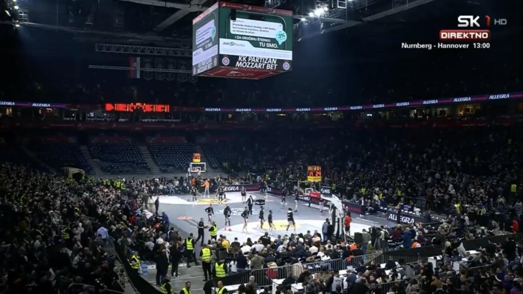 20.20 - Podsećanja radi, Partizan na večerašnjem meču odrađuje kaznu! Naime, pre nekoliko dana je dicsciplinska komisija Evrolige novčano kaznila crno-bele iznosom od 50.000 evra i smanjenjem kapaciteta dvorane za 20 odsto, iliti oko 4.000 ljudi.