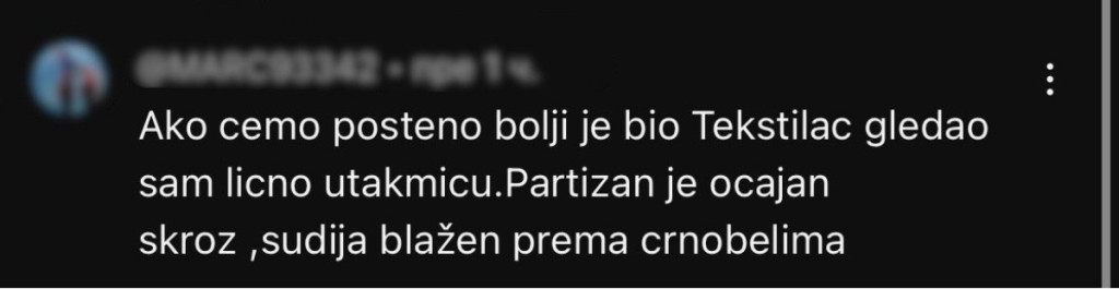 "Ako ćemo pošteno, bolji je bio Tekstilac, gledao sam lično utakmicu, Partizan je očajan skroz, sudija je blažen prema crno-belima", "Terajte Vukotića, dečko je sa dve leve noge", "Šta ima veze, i iz penala se može pobediti", "Dobra igra, ali dosta šansi promašujemo", "Može li ikako bez Šćekića", "Vukotića vratiti odakle je došao", "I Šćekić pogodi stativu na prošlom meči, samo Đorđe Jovanović još ništa". "Kotrljamo se nekako, ali dobro", "Kad vidim Nikolića, ubije mi želju za utakmicom", "Neiskusna odbrana, za leto treba da se dovede zreli štoper", "Koga ovde zanimaju ova dva kluba"..., samo su neki od komentara "grobara" na društvenim mrežama.