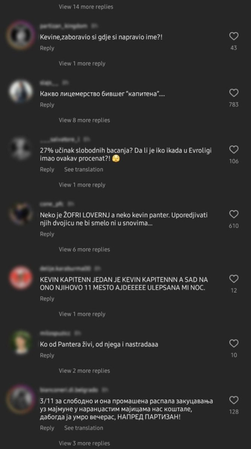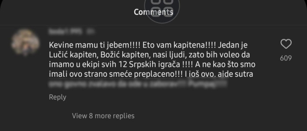 "Kevine, mamu ti je*em! Eto vam kapitena. Jedan je Lučić kapiten, Božić kapiten, naši ljudi! Zato bih voleo da u ekipi imamo 12 srpskih igrača. A ne kao što smo imali ovo strrano smeće preplaćeno", napisao je jedan od navijača Partizana.