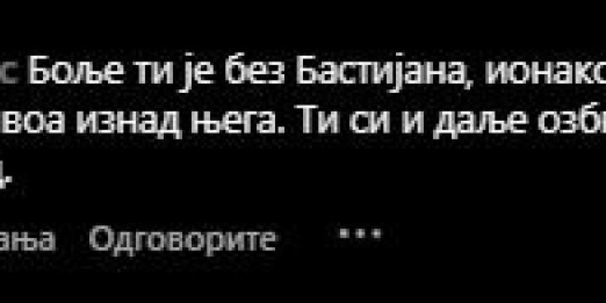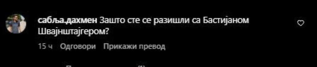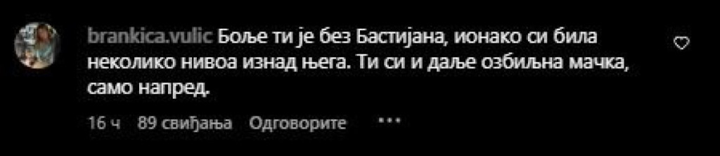 "Samo na Instagramu sve deluje super", "Bolje ti je bez Bastijana, ionako si bila nekoliko nivoa iznad njega. Ti si i dalje ozbiljna mačka, samo napred", "Zašto si se razišla sa Bastijanom", "Jedna veoma harizmatična, prelepa i kulturna devojka, ne zna šta je tražila sa njim. Njen izbor je bio, ali nadam se da će naći pravu ljubav", "Ne nosiš burmu?", samo su neki od komentara ispod objave nekada sjajne teniserke.