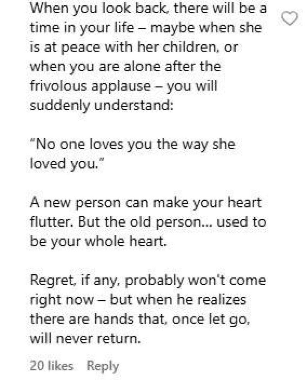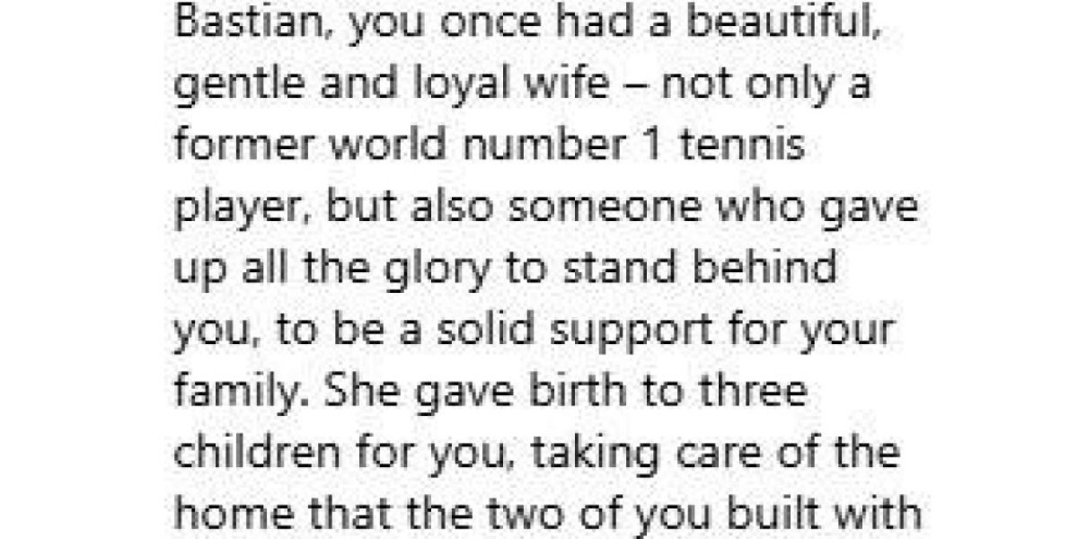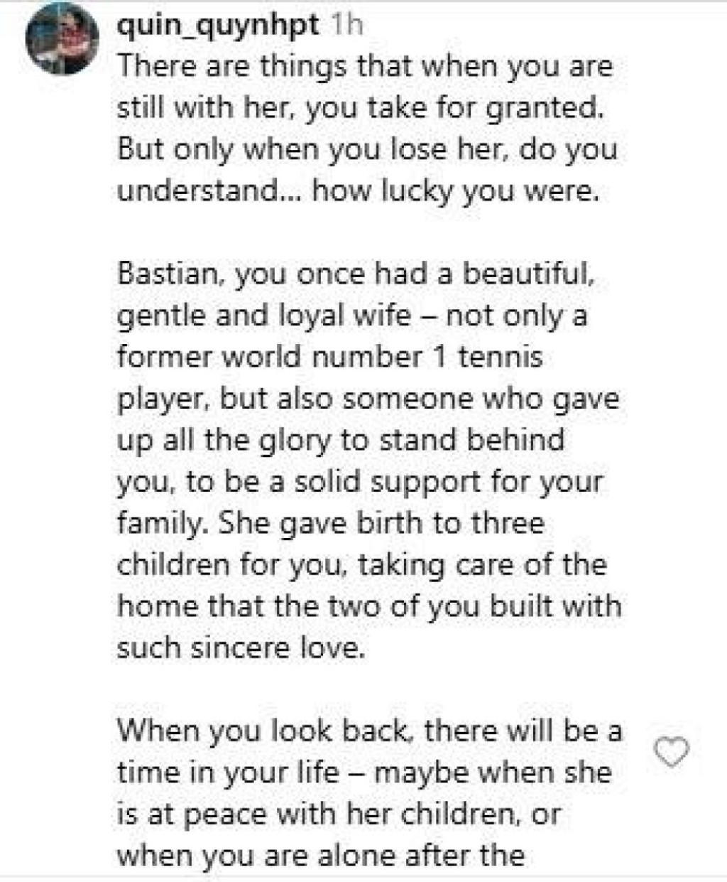 "Tek kada je izgubiš, tada ćeš da shvatiš koliko si imao sreće. Bastijane, imao si lepu, nežnu i lojalnu ženu, ne samo bivšu prvu teniserku sveta, nego nekoga ko je dao svu svoju slavu da bude uz tebe i da bude podrška tebi i porodici. Rodila je troje dece, brinula od kući, da biste izgradili tako iskrenu ljubav. Razumećeš da te niko ne voli na način na koji te ona voli. Nova osoba će možda da ti ubrza rad srca, ali je stara osoba ta koja je bila celo tvoje srce. Žalićeš kada shvatiš da ti se nikada neće vratiti ruke koje su te pustile", piše u komentaru ispod Bastijanove objave.