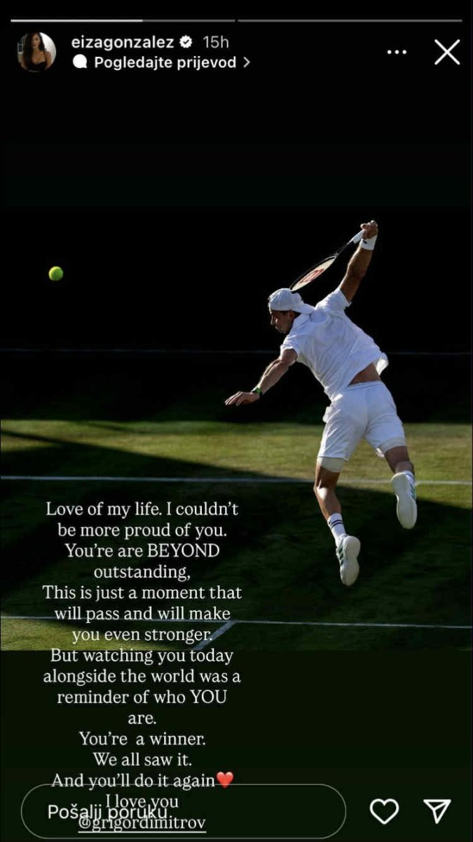 Kako je sinoć bugarski teniser doživeo debakl i bio primoran da preda meč Sineru, oglasila se i njegova lepša polovima Eiza Gonzales. Meksikanka koja mu je ptužala podršku sa tribina, učinila je to i putem svog "Instagram" profila.