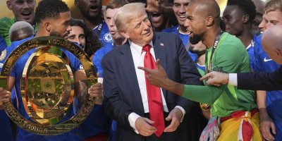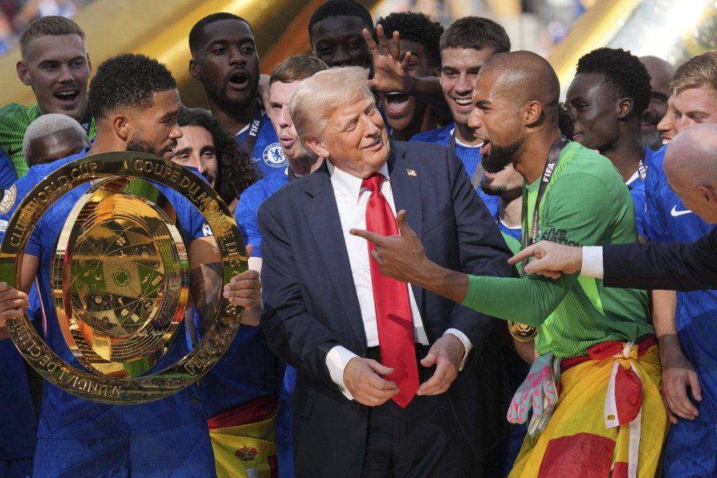 Nakon što je londonskom klubu uručen pehar posle pobede nad Pariz Sen Žermenom (3:0), a bivši predsednik Amerike Tramp se pridružio ekipi kao da je i on jedan od igrača, te nije želeo da siđe sa iste. Naprotiv, ostao je među igračima, pozirao pored kapitena Risa Džejmsa, zvezde utakmice Kola Palmera, i sa ostatkom veselog društva.