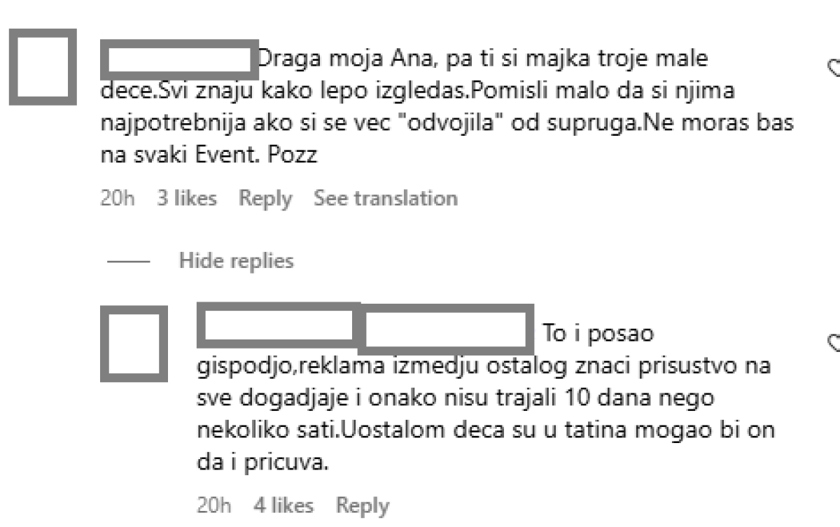 "Draga moja Ana, pa ti si majka troje male dece. Svi znaju kako lepo izgledaš. Pomisli malo da si njima najpotrebnija ako si se već "odvojila" od supruga. Ne moraš baš na svaki događaj", jedan je komentar na Instagramu.