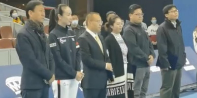 Pengova je među gostima na finalu Fila Kids Junior Tenis Čalendžer, obučena u tamnoplavu jaknu i bele pantalone, prenosi Rojters.