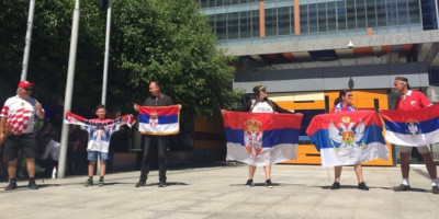 Fotorafija je nastala ispred zgrade Federalnog suda. Gospodin u dresu Hrvatske, pa navijači sa zastavama i obeležjima Srbije i Crne Gore!