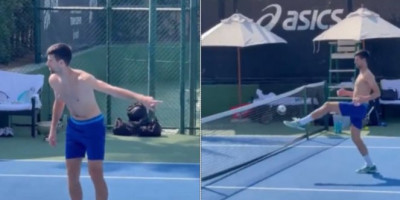 Pošto je u Dubaiju trenutno leto uz visoke temperature, Novak se skinuo majicu i pokazao svoje veštine u popularnoj igri koju u Srbiji mnogi igraju od malih nogu.