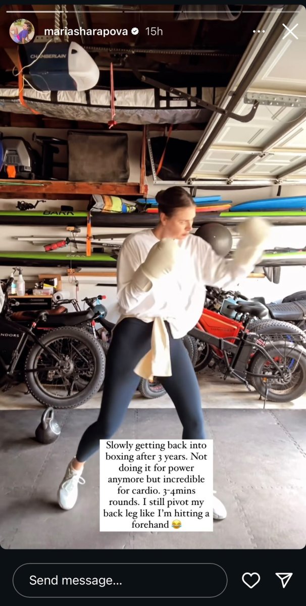 "Polako se vraćam boksu posle tri godine. Ne radim to da bih ojačala više već zbog neverovatnog kardija. 3-4 minuta po rundi. I i dalje pivotiram zadnjom nogom kao da se spremam da udarim forhen", napisala je Šarapova.