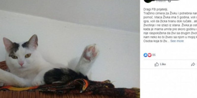 - Dragi FB prijatelji, tražimo cimera za Živku i potrebna nam je vaša pomoć. Maca Živka ima 5 godina, voli da se mazi i igra, voli da žicka hranu dok ručate, ali ne voli druge životinje i ne izlazi iz stana. Živka je ostala sama kada je mama umrla pre skoro godinu dana, i pošto nije raspoložena da živi sa drugim životinjama treba nam neko ko bi živeo sa njom u mojoj kući na Umci.