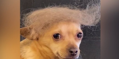 Pas je maskiran u Donalda Trampa. Mali pas nije se bunio, dok mu je vlasnica pravila frizuru, a i izgleda da je siguran da baš liči na Tampa.
