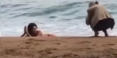 Dok se unuka prevrtala po pesku, baka je u blago čučećem položaju sve to fotografisala u stilu profesionalke.