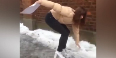 Kada je poledica i klilzavo jedva hodamo i kada smo u ravnoj obući, a kada hodamo na štiklama to izgleda upravo ovako! Devojka je jedva uspela da ne padne, ali je bilo tesno.