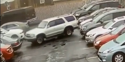 Dok SUV udara u BMW i Toyotu Camri, jedan od prolaznika se hvata za glavu.