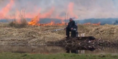 Na snimku je zabeležen trenutak tokom kojeg pecaroš ni najmanje ne obraća pažnju na to da požar besni nekoliko metara iza njega, dok guta suvu travu.